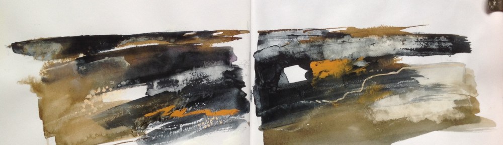 However, this time I was drawn to the variety of surface texture, linear marks, colour and play of light on the upland plateau itself. Whereas the flowering heather covered the moors in a glorious purple last august, this time the colours were quieter, with striking rectangular patches of burnt heather suggesting possibilities for abstraction. With the stone outcrops, yellow lichen, patches of sienna-coloured soil and the dry vegetation, lit by sun or deep in shadow, I was confronted with an extensive patchwork of textures. Now I need to think how I want to treat these surface impressions back in the studio and where I’m taking them.