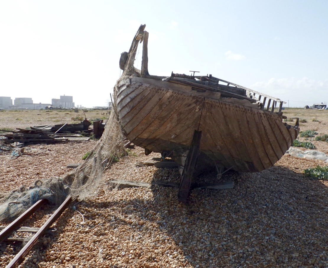 100_2262 Published 11/09/2019 at 1110 × 908 in Dungeness: sun, angels & black tar Decaying boat, Dungeness. © Mari French 2019