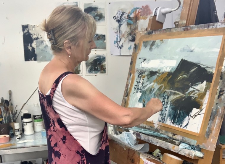 I’m an abstract mixed media artist inspired by the liminal landscapes of coastline, salt marsh and moorland; I also have a passion for contemporary florals. My work reflects my experience of landscape through the layering and eroding of media and the use of energetic mark making, creating a rich surface history with an emphasis on space and light. A limited palette gives harmony and coherence, resulting in work that stands alone but still owes a debt to its subject. My design background often emerges in my artworks through effective colour combinations, strong composition and use of typography.