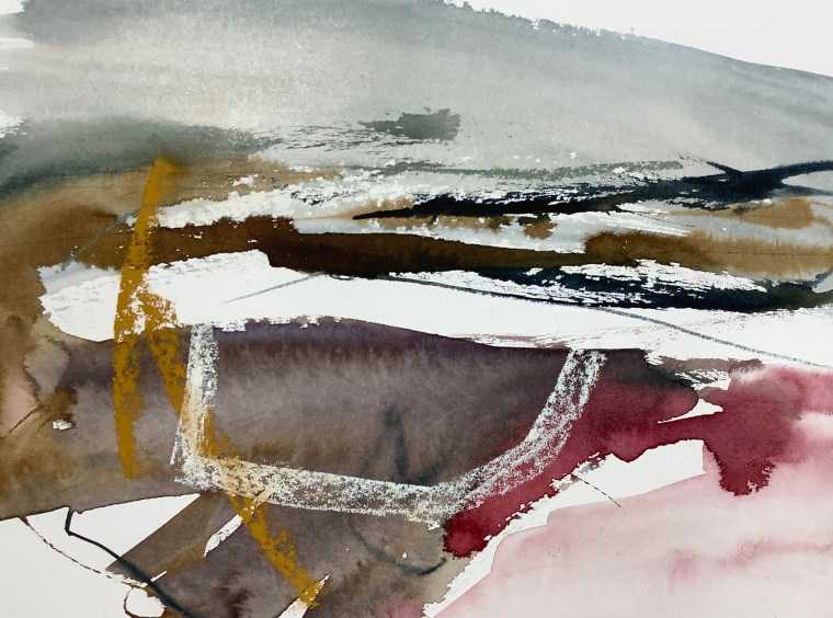 ‘Unfolding coast’, ink/pastel on paper, 21x29cm, SOLD. © Mari French 2021
