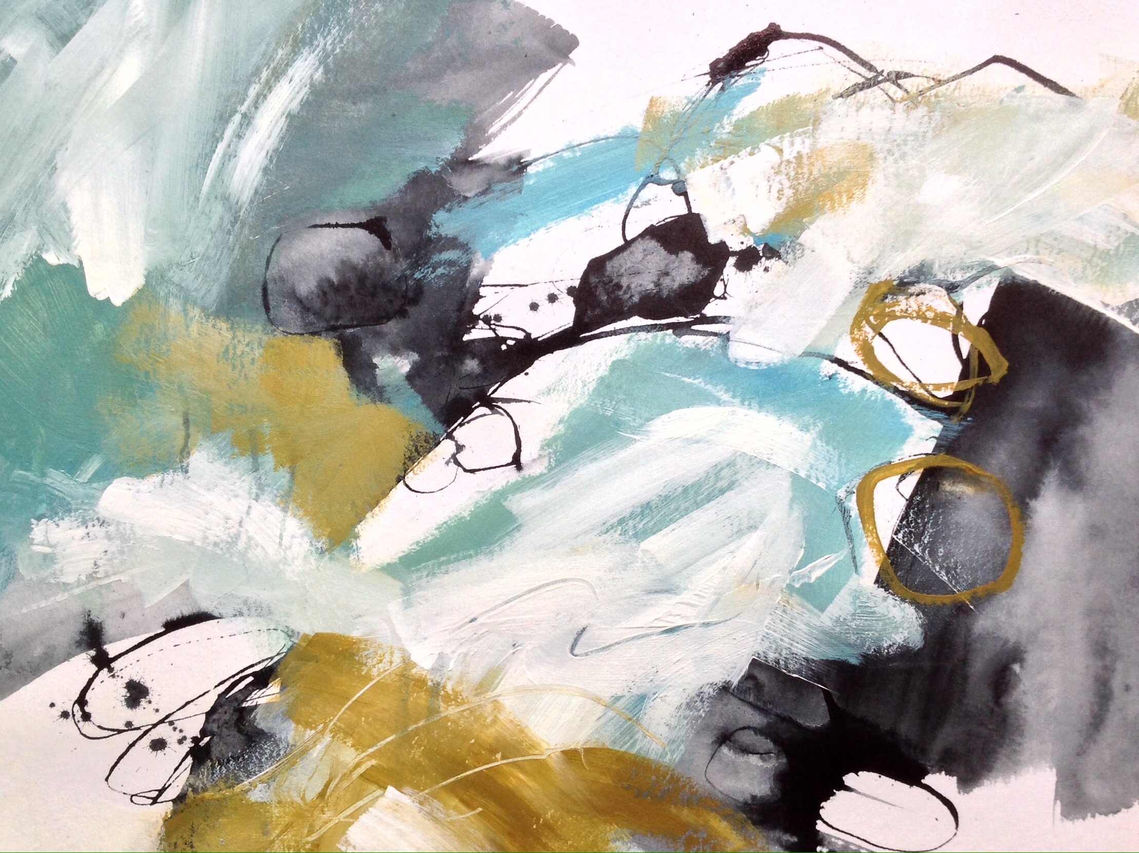 To start with I’ve been working on small mixed-media pieces on paper including the two shown here, but this time with a wet-in-wet acrylic ink base. I wanted to evoke the feeling and sound of the tide approaching over the rocks and of the crashing waves inundating the pool, which is set into the rocks.