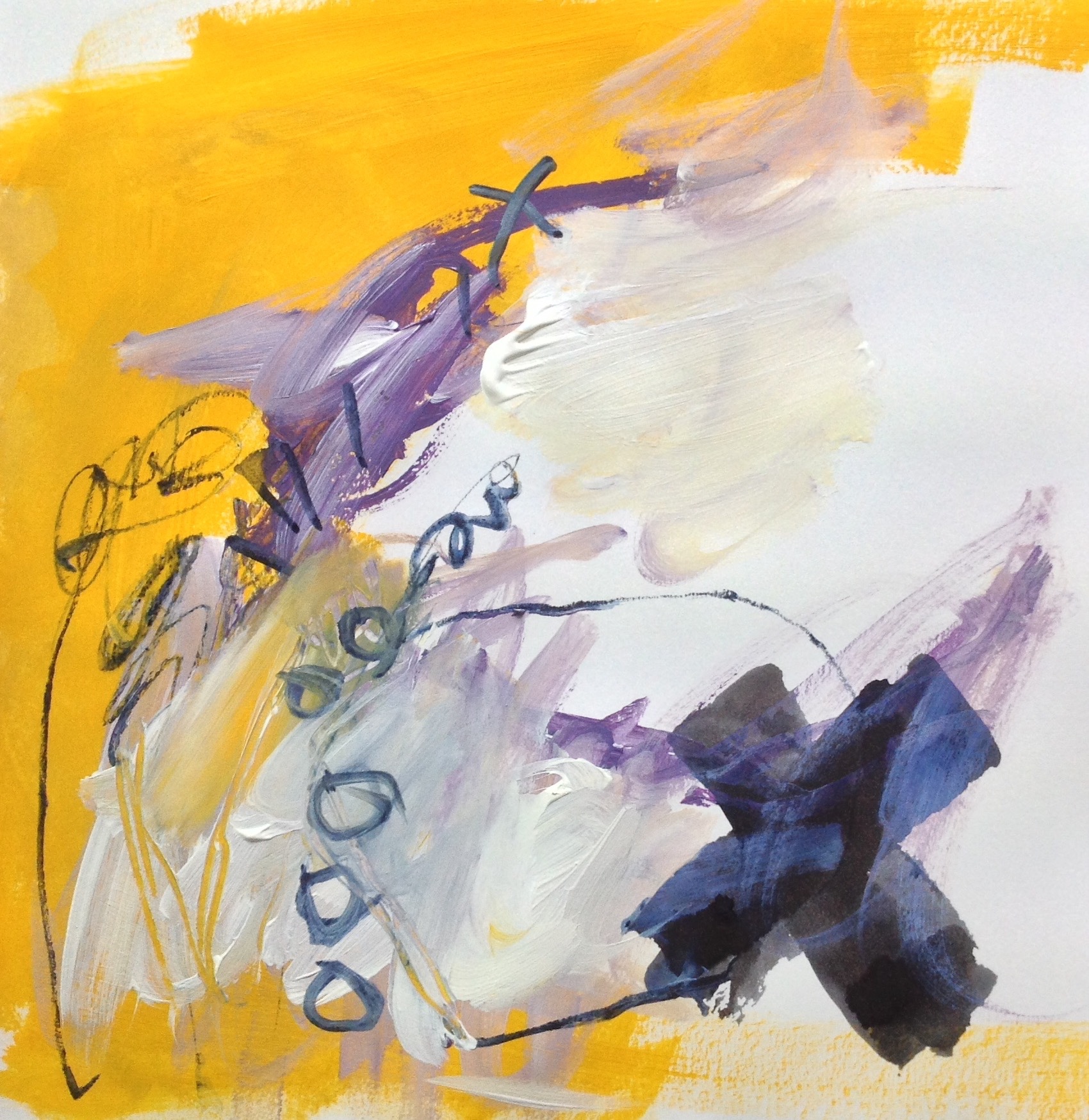 Above is one of the autumn sunflowers series still in progress on the easel, in acrylic and ink on paper. I love to paint intuitively like this – obscuring and revealing layers of acrylic paint, scoring through or spraying with water, to create lively marks – so that the result is a complex accumulation of shades, hard and soft edges, ephemeral suggestions of shapes. Sometimes these are created by wiping through the paint layers with a damp cloth. Inevitably, much of the earlier stages will be covered up (or wiped away), but this is necessary for me to create the web of colour and texture I like.