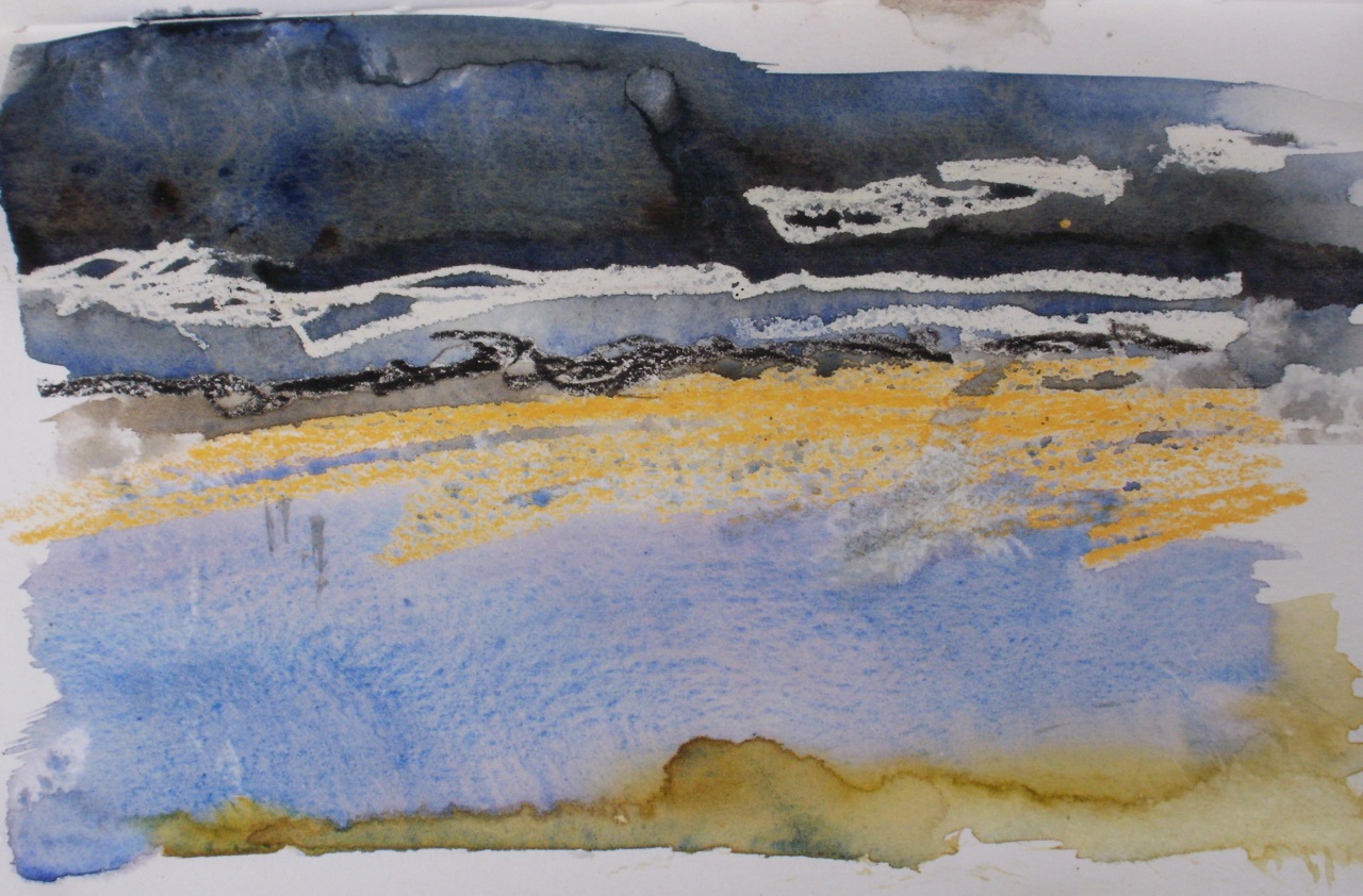 I used oil pastel here for quick blocking in of features before flowing wet in wet watercolour over the top (first time I’ve tried this technique outdoors and it gives useful, speedy and lively results as the pastel acts as a resist to the paint. I like the broken colour and flecks of paint that result.