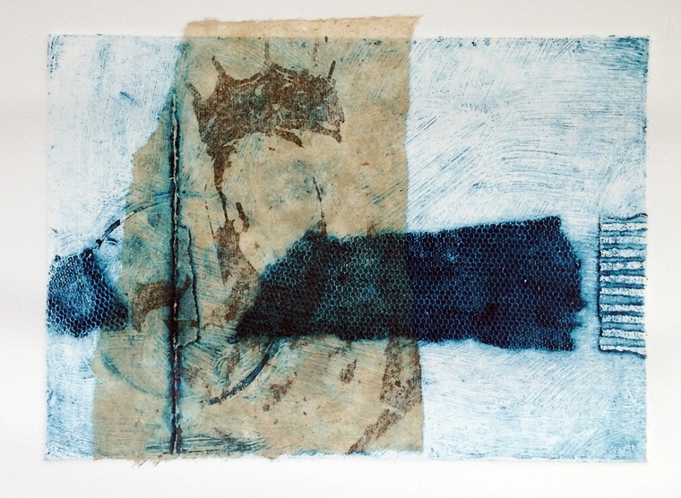 In between painting bouts I often have a complete change by creating Collagraph prints – textured, limited-edition images hand printed on a small etching press from a collaged plate. I sometimes add Chine Colle (scraps of tissue or handmade paper). I’ve recently begun transferring high contrast black and white images from my own photos onto the chine colle (a favourite of mine is the exquisite Lokta paper) to add a further dimension of interest.