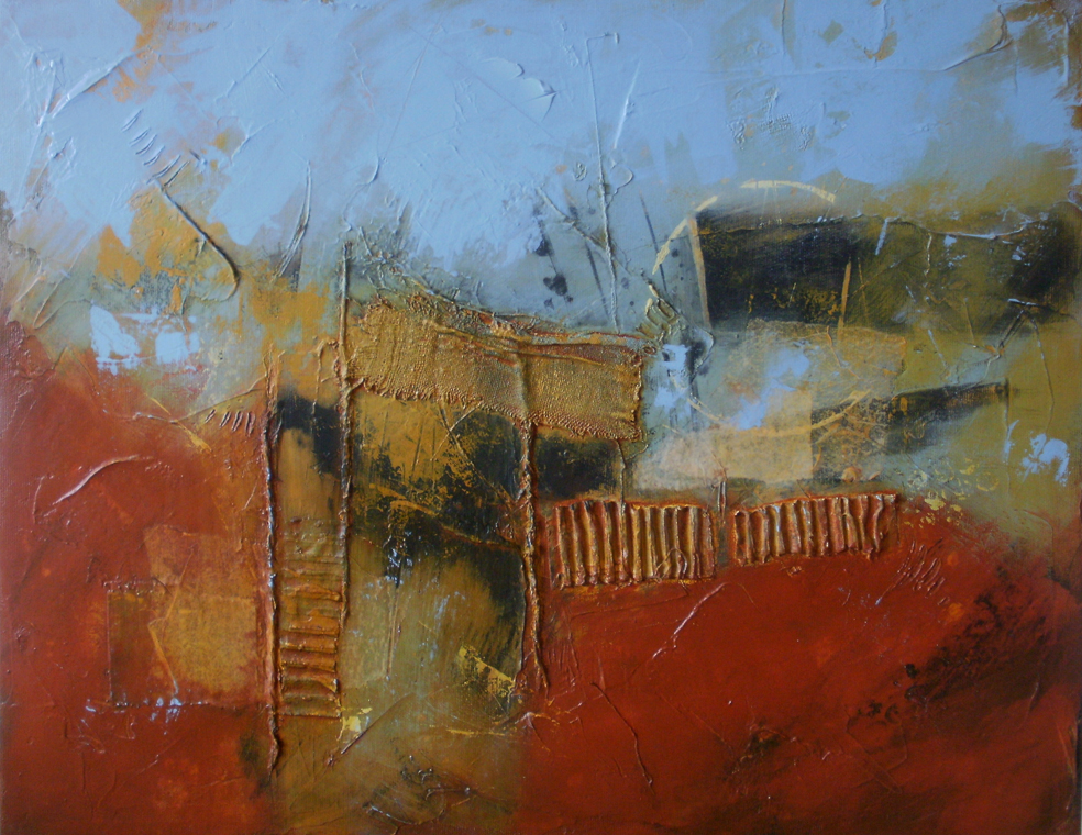 Below are the two most recent mixed media artworks I’ve produced on this theme. Again I’m exploring my response to the red iron oxide covered ground, the bright turquoise verdigris leaching from the copper adits where they emerge from the sea cliffs below the mines, the stark finger-like stacks pointing skywards.