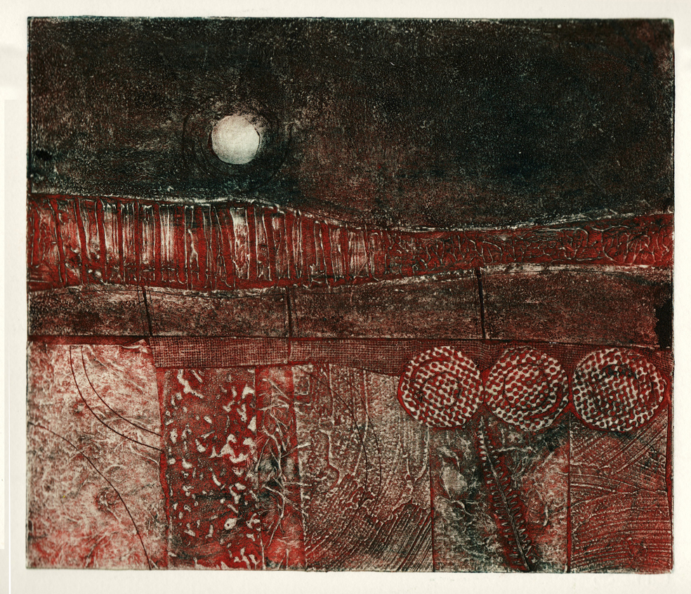 Below you can see the basic collagraph plate from which I produced the ‘Harvest moon’ prints in this post. What I found most fascinating is that the most humble and unpromising materials can result in really interesting textures in the resulting print. The sky on this plate is sandpaper, the lower ‘field’ textures are scraps of B&Q wallpaper samples.