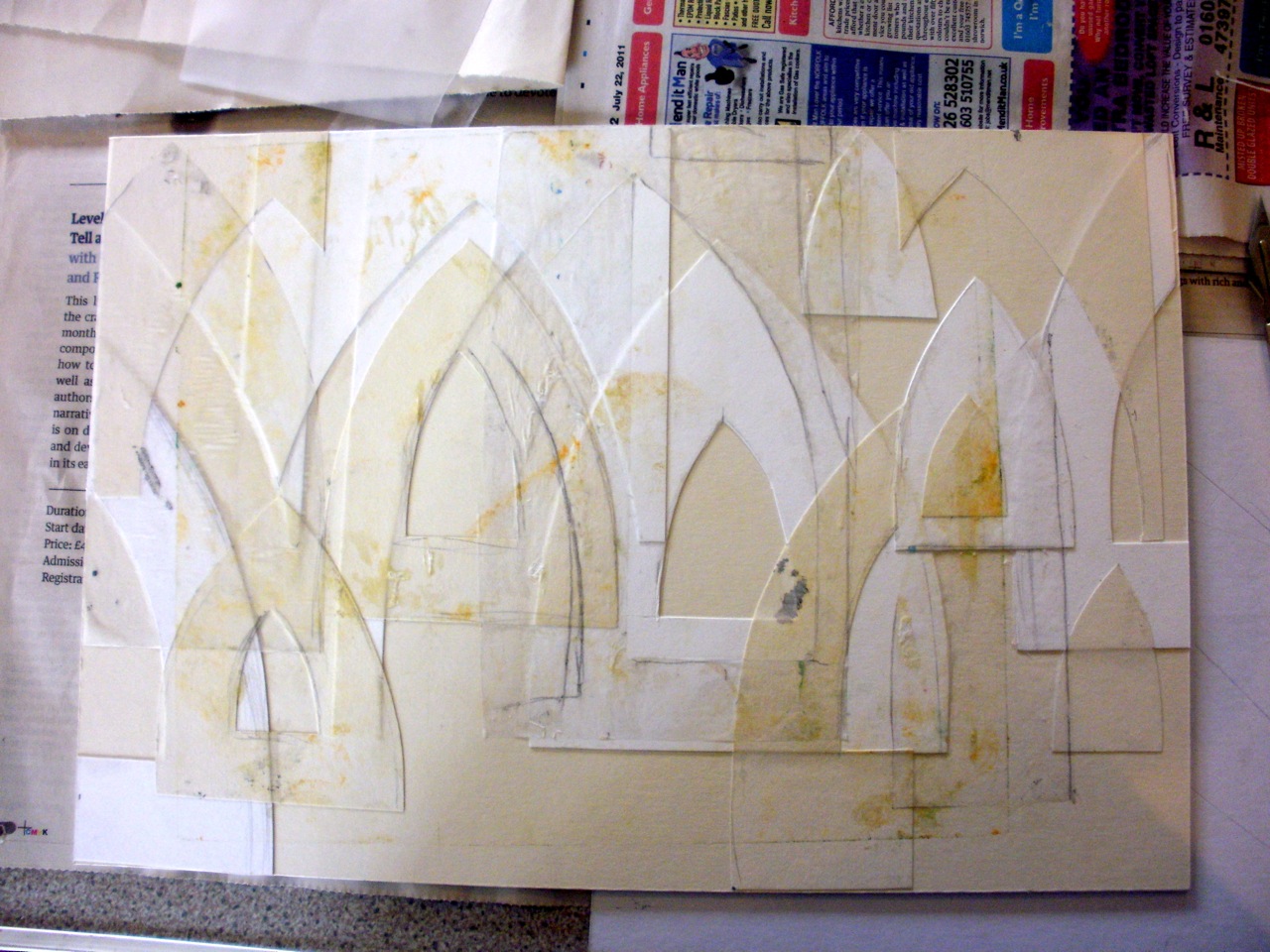 The method of building up overlapping layers, creating further shapes, is an alternative method of collagraph platemaking shown in the second ‘Arches’ plate below left.