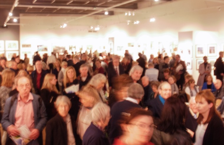 Visitors studying Jean Noble RI’s vibrant abstracts