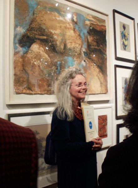 The range of media used was interesting, varying from watercolour, gouache, acrylics and inks often combined with other materials – collage, earth(!) etc. Frances Hatch (photo below) was awarded the Shenzhen International Watercolour Biennial Prize for her large unusual work ‘Ladram Red’ which included Otter Sandstone, Mercia Mudstone, gouache in its makeup.