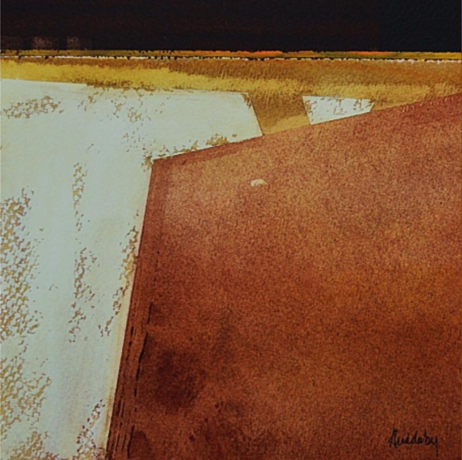 ‘Autumn Fields’ by Andrew Suddaby, watercolour and acrylic, 23x23cm. An exquisite minimalist small abstract landscape in siennas and ochres.